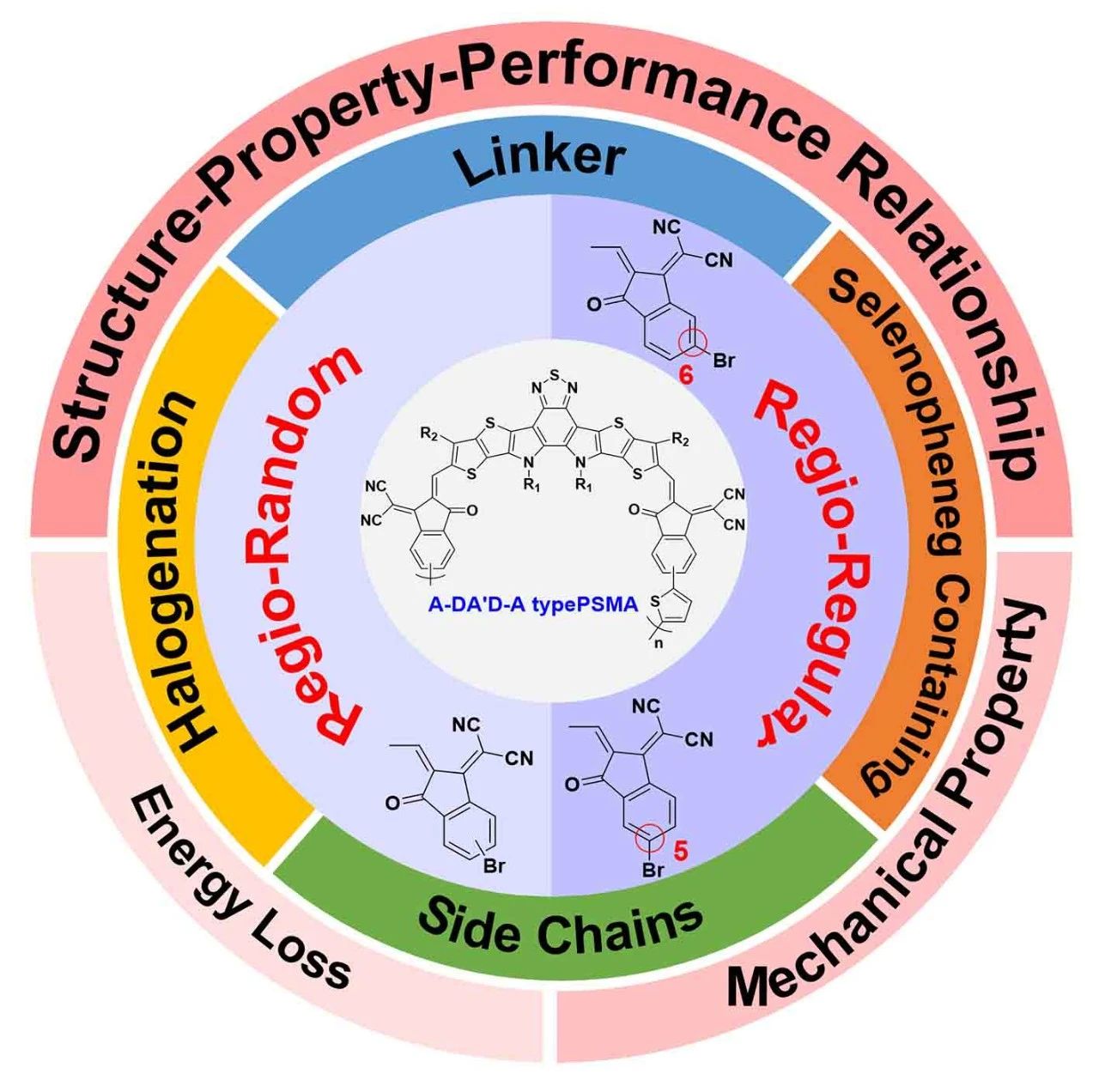 在本综述中,首先,作者根据骨架聚合位点及三元共聚策略,将聚合物分为区域不规整、区域规整和三元共聚三个系列,重点介绍了这三个系列A-DA’D-A型PSMAs的最新进展,分别从侧链、卤化、硒酚化和共聚单元等方面对其结构-性质-光伏性能之间的构效关系进行了深入系统地阐述。通过数据对比,本文得出结论:相对于区域不规整系列,区域规整系列聚合物要给出更高的短路电流和填充因子,尽管两个系列均能给出高于0.9 V的开路电压。其次,介绍了基于A-DA’D-A型PSMA的all-PSC的机械柔性和拉伸性能,并将其与PSMA的分子结构关联,以期提供一些设计具有高机械性能的PSMA的结构基元信息。第三,系统总计了A-DA’D-A型PSMA的辐射能量损失和非辐射能量损失,并将其与PSMA的分子结构关联,以期给出一些可以给出低能量损失的结构基元信息。在此基础上,本文从PSMA型分子设计新策略、机械柔性以及相对较低的短路电流和填充因子等三个角度提出了展望。