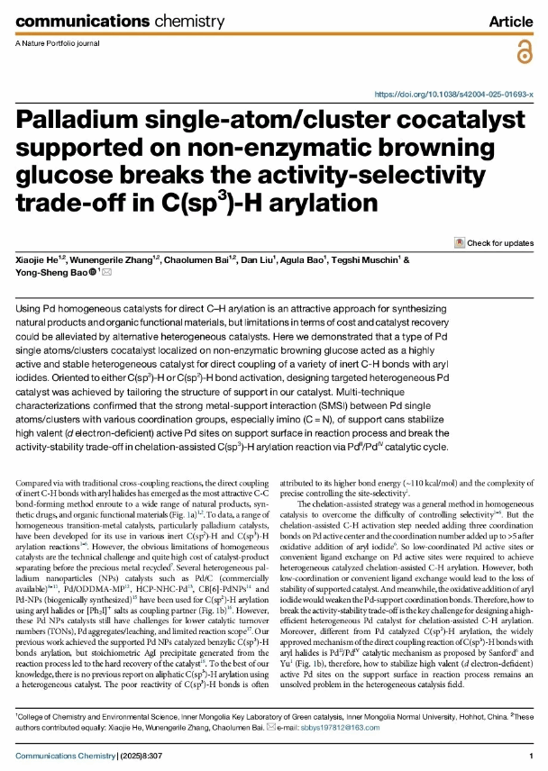 近日,永利集团304包永胜科研团队在Nature旗下期刊Communications Chemistry(中国科学院一区Top期刊)发表了“非酶褐变葡萄糖负载的钯单原子/团簇共催化剂打破C(sp3)-H芳基化的活性-选择性权衡”(Palladium single-atom/cluster cocatalyst supported on non-enzymatic browning glucose breaks the activity-selectivity trade-off in C(sp3)-H arylation)的最新科研成果。 均相钯催化惰性C-H键与碘苯的直接偶联反应是一个合成天然产物、有机功能材料的先进方法。但是这种方法面临催化剂/产物分离困难、贵金属难回收等局限,很难用于大规模工业化生产。另外,螯合辅助策略是实现精准控制C-H键的选择性活化的常用方法,但是已经报道的多相钯催化剂,如钯纳米颗粒和钯单原子,在螯合辅助C-H键活化反应中很难兼顾高催化活性和高选择性。针对上述科学问题,研究团队利用食品科学中常见的美拉德反应,开发了一种非酶褐变葡萄糖负载的钯单原子/团簇共催化剂,用于多种惰性C-H键与碘苯的直接偶联反应的高效、稳定多相钯催化剂。