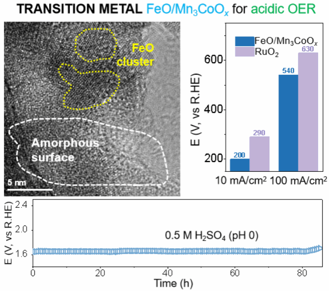 在全球“碳中和”战略加速推进、氢能产业迈向规模化落地的关键阶段,质子交换膜水电解凭借高效、高纯、适配可再生能源波动的优势,成为绿色制氢主流技术路线。但阳极析氧反应动力学缓慢、商业化催化剂高度依赖稀缺贵金属铱,开发低成本、高活性、强稳定性的非贵金属酸性析氧反应催化剂,已成为能源催化领域的全球性攻关课题。近期李杲&张静静团队在“非贵金属酸性析氧反应催化材料”领域取得重要突破,创新性提出“限域盐调控—异质界面协同—催化机理重构” 一体化设计策略,构筑了 “FeO/Mn3CoOx 复合型非晶氧化物催化剂”,在酸性介质中实现媲美甚至超越商业贵金属催化剂的电催化性能,为低成本、规模化绿氢制备提供了全新技术路径。该成果可直接适配规模化绿氢生产场景,有力推动绿氢成本下降与产业化进程,助力全球能源清洁低碳转型。