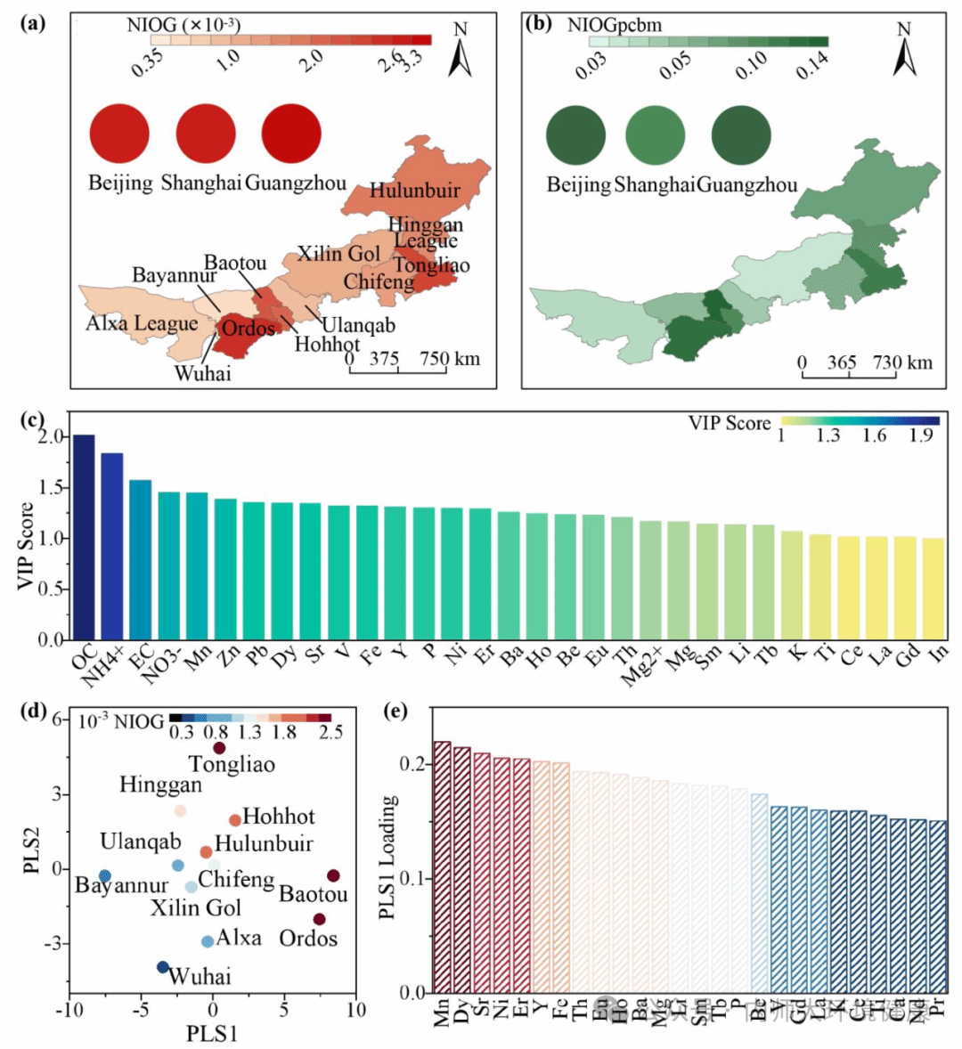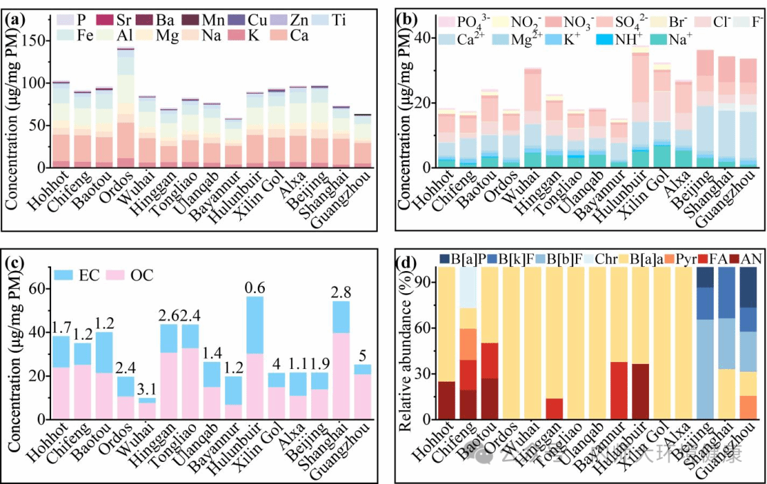 内蒙古作为我国重要的能源基地,各盟市因产业布局差异,大气颗粒物污染源具明显区域特征。永利官网环境健康研究院的团队成员牛牧童等通过收集内蒙古自治区12个城市的汽车空气滤芯颗粒物(PM)样品,分析了其化学组分与氧化潜能(OP)。结果表明,12个城市的PM化学组分与OP存在显著差异,经质量归一化的OP在12个城市间差异高达7倍。以钢铁生产和稀土开采为主的工业城市(如包头、鄂尔多斯)表现出极高的金属元素(如Cr、Li、Mn、Ce、Nd)富集,这可能导致了当地PM具有最高的OP;同时,PM携带的多环芳烃(如苯并[a]芘、芘、蒽)成分谱也显著区别于大型城市。研究识别出Mn、Zn和稀土元素是OP的关键化学驱动因子,而特定的真菌属则能直接影响OP,或与化学组分产生协同作用。结果还揭示了PM组分在城市间的巨大差异,因此迫切需要从基于质量浓度的评估框架,转向基于化学组分和污染源导向的、可执行的健康风险评估框架。