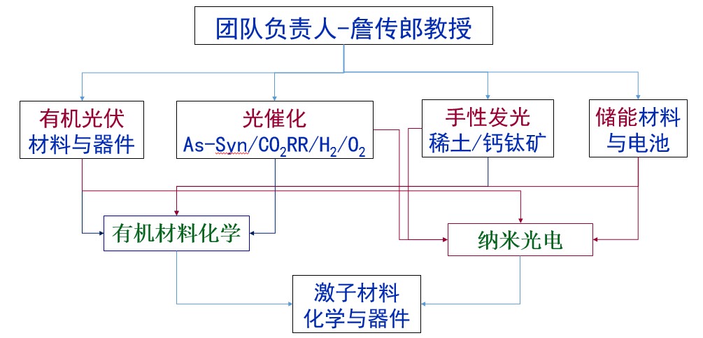 激子材料化学与器件团队(EMC&DTeam)围绕有机材料化学和纳米光电两个领域,重点聚焦以下四个研究方向:有机光伏材料与器件、光催化(CO2还原、水分解及不对称合成等)、手性发光材料与器件(稀土/钙钛矿)、储能材料与电池。