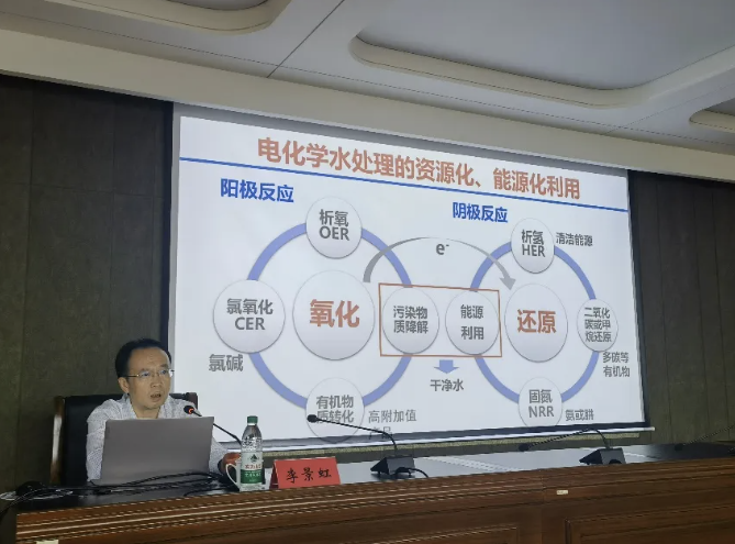 李景虹结合过去几年的研究工作,深入剖析了电化学水处理的资源化、能源化利用中的关键作用,系统性介绍了水污染循环全过程解析、高效电化学转化过程:电极界面活性层构筑、基于自由基的高级氧化水处理技术以及电化学水处理方法降解水中有机物等前沿电分析化学平台与技术。这些创新技术手段为解决有机污染物降解的基础科学问题提供了坚实的技术支持,对于推动解决环境治理问题具有重要意义。报告中,李景虹耐心解答了与会师生的疑惑,并以其严谨求实的科学态度、独特的科研视角、高深的学术水平赢得了热烈掌声。