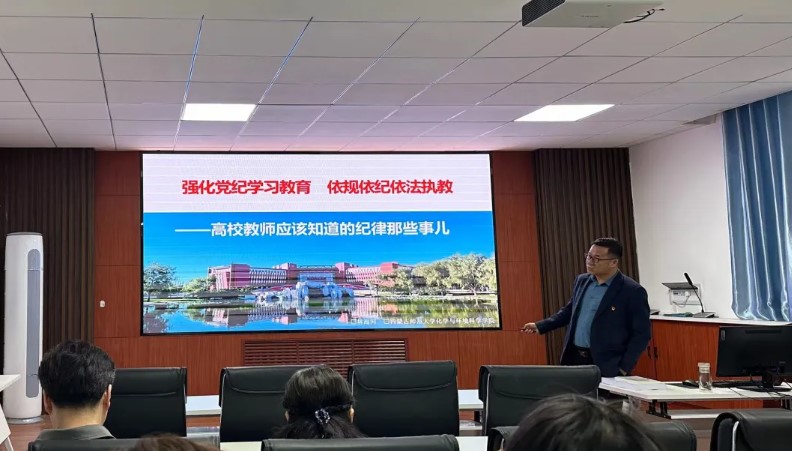 林海河围绕《中国共产党纪律处分条例》《事业单位工作人员处分规定》《中华人民共和国监察法及实施条例》《中华人民共和国公职人员政务处份》等与高校教师密切相关的党纪法规,着重罗列出规范性文件中的教师禁止行为,对审查调查程序、纪律处分的种类及处分影响进行深入解读,引导党员教师加强党纪学习教育,进一步强化纪律意识,严守纪律规矩,筑牢“正己”之魂。