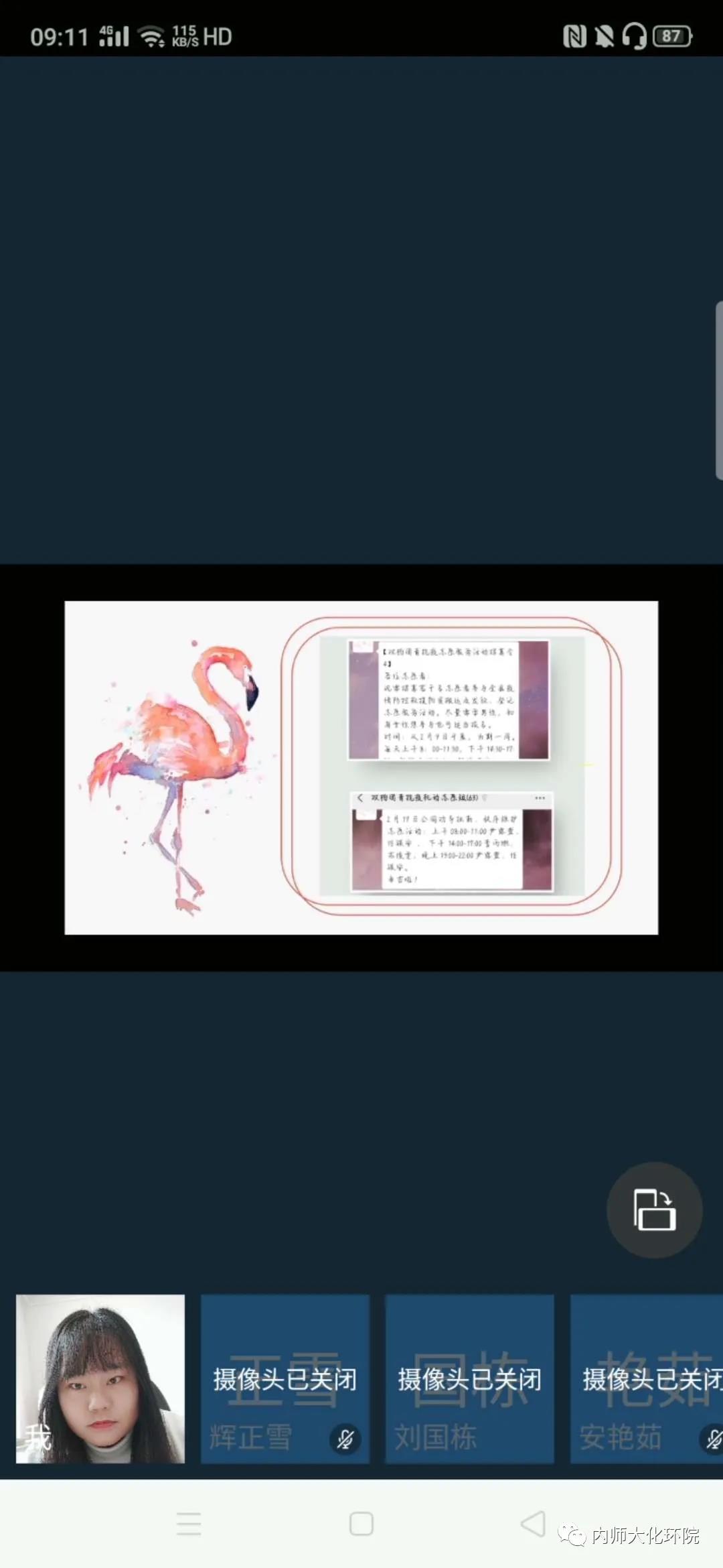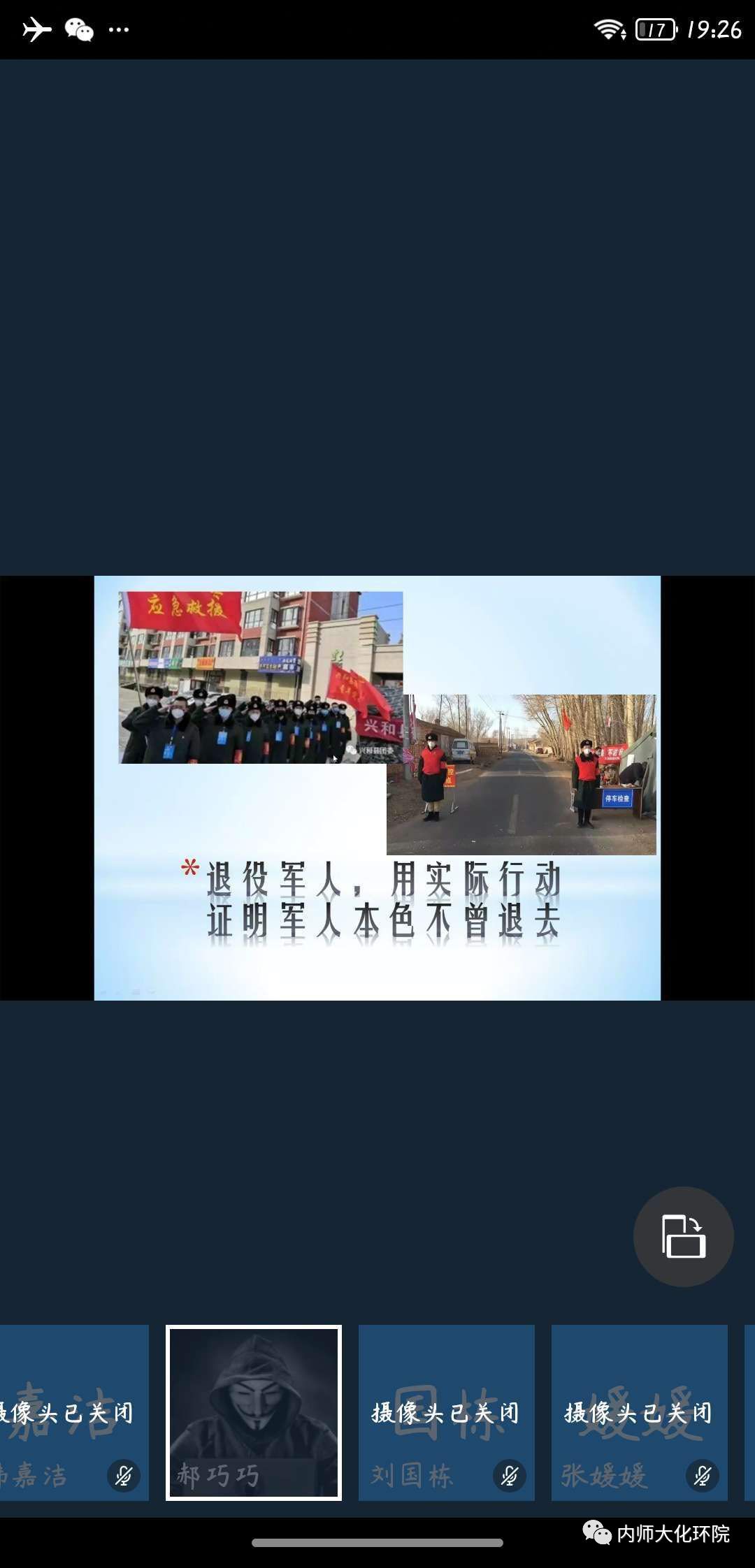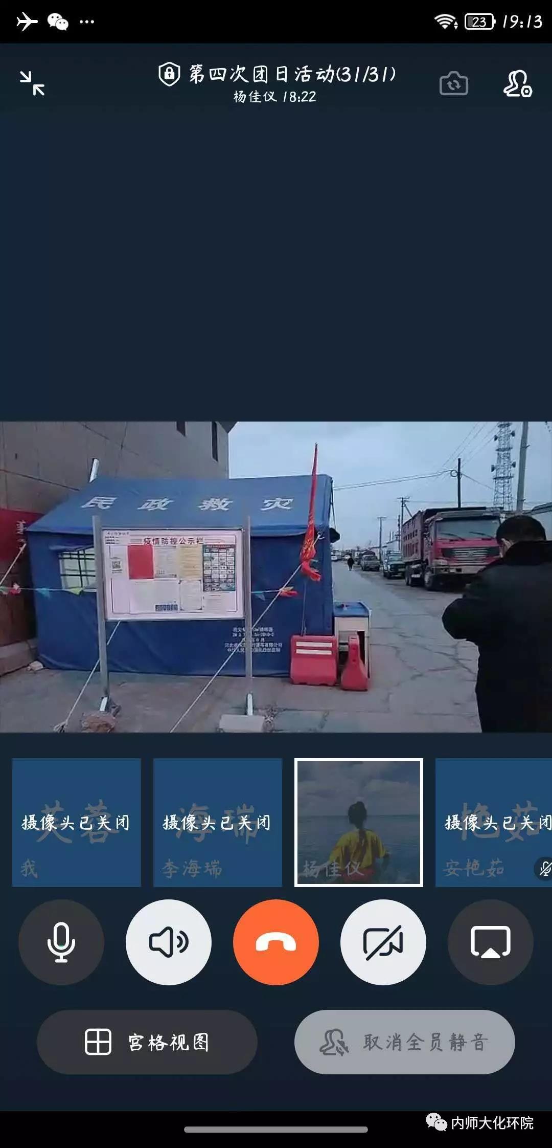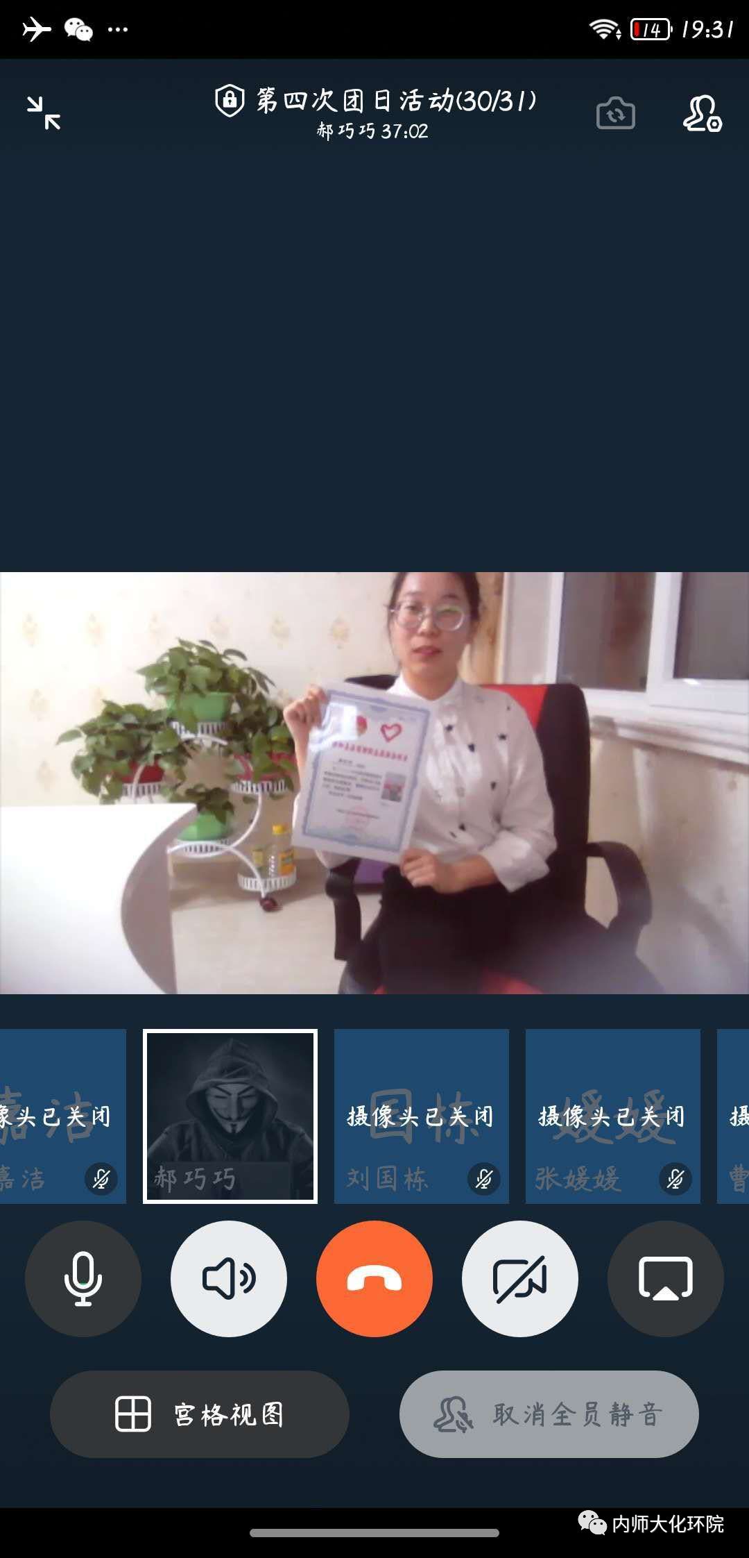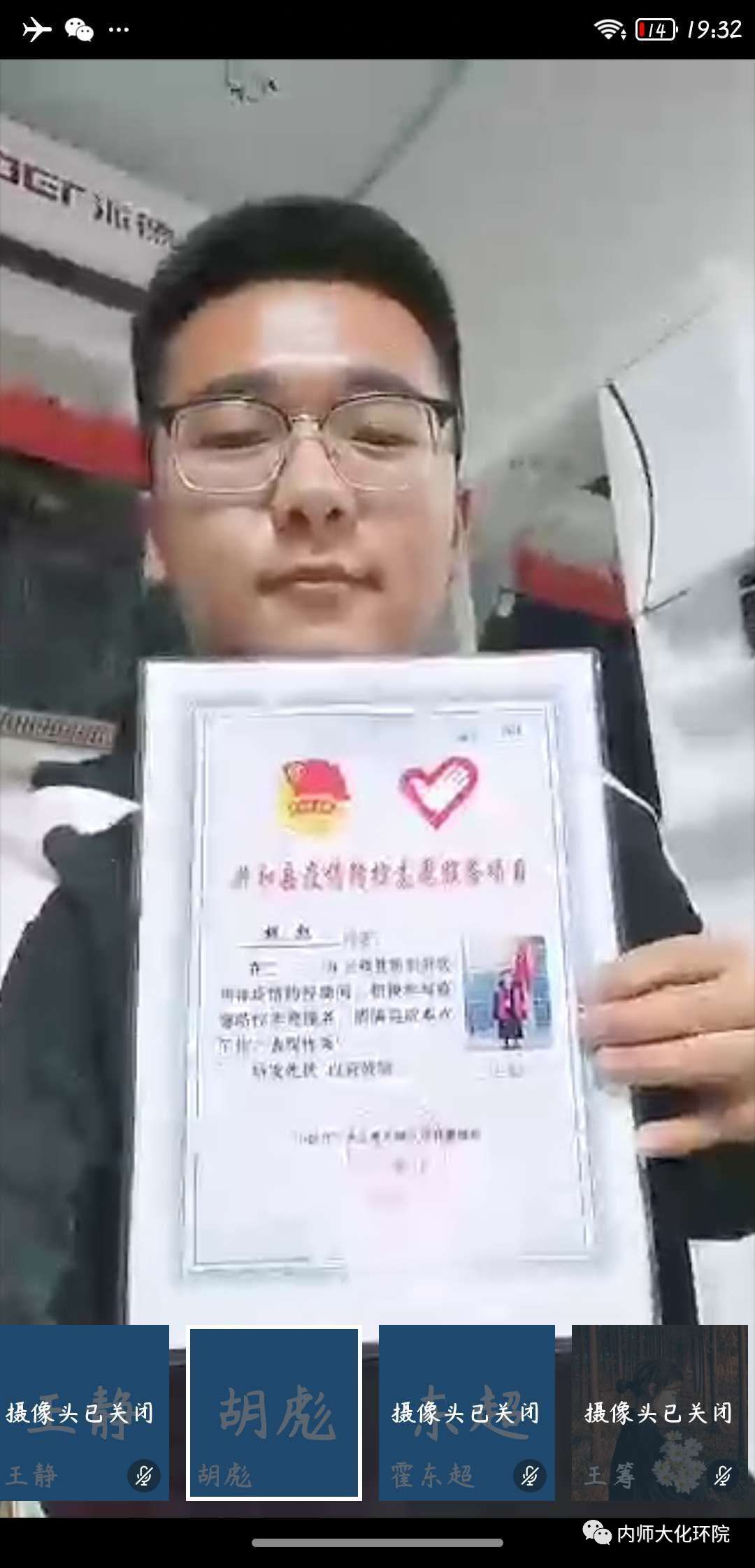 山川异域,风月同天。在全国万众一心助力疫情防控工作的特殊时期,我院2019级环境科学汉班全体同学积极响应学院号召,利用腾讯视频会议开展了线上主题团会。本次团会主要内容是各位同学分享、交流疫情防控期间的感想。首先,19环汉的团支书和同学们分享了自己在疫情期间志愿者服务的经历和感受。她向同学们介绍自己作为志愿者的工作内容,并号召同学们积极配合当地政府和社区的安排。除此之外,她还鼓励本班同学在做好疫情防控的同时也要做一些力所能及的事情,为疫情防控贡献出自己的一份力量。