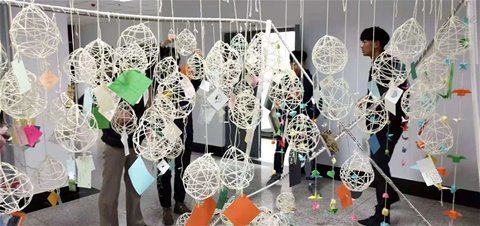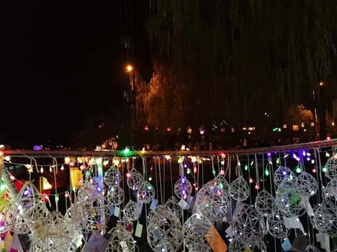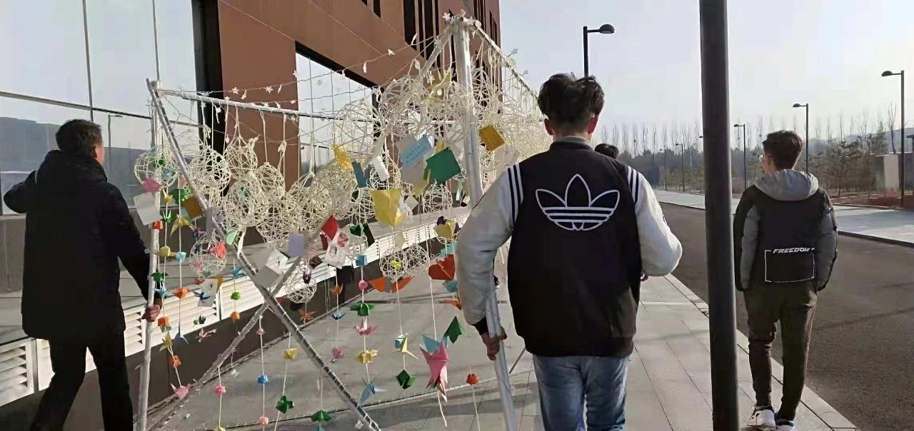 我院学生会的成员们对花灯的制作十分积极,从最开始的用气球制作花灯模型,到收集同学们对化环院美好祝愿的卡片,再把这些卡片都穿到花灯上,大家都付出了很多努力和辛苦。最后,我们把同学们为学院叠的千纸鹤穿到已经搭好的花灯架上并挂上彩灯,花灯的制作便圆满完成。