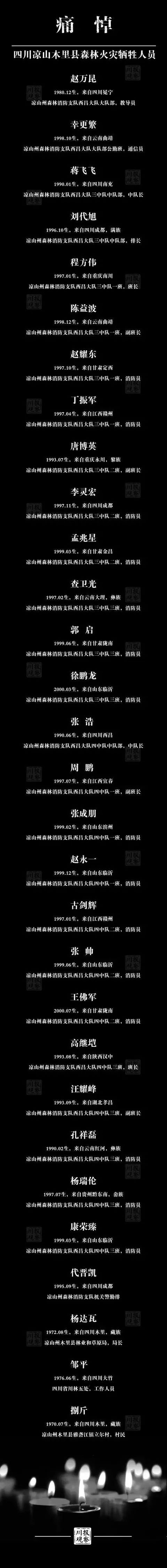 前有革命先烈抛头颅洒热血,现有四川消防冲火场保民安。2019年3月30日,四川凉山木里县发生森林火灾。27名森林消防队员和3名地方干部群众在火灾扑救中牺牲。他们生为勇士,逝亦国殇。阳光普照,是因为有人尽忠职守;岁月静好,是因为有人负重前行。他们没有平安归来,没有比这更令人痛心的消息。30个生命葬身火海,30个家庭的悲伤!