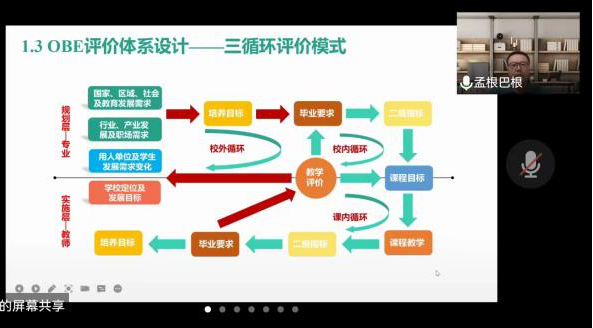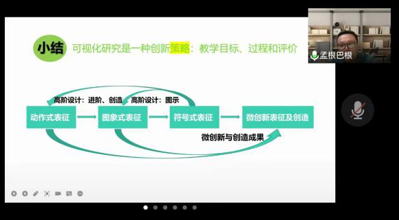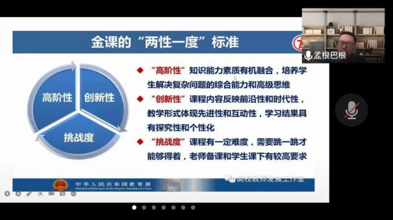孟根巴根教授结合自己的课堂教学工作,应用典型案列,主要从师范专业认证的背景分析、课程目标和教学大纲,课堂教学目标、学习需求和教学过程,课堂教学评价、反思与改进三方面介绍了如何进行教学大纲的撰写与课堂教学的设计,提出教师的课堂教学目标清晰、设计思维可视达到课程的高阶性,学生学习目标明确、行为思维可测达到课程的可评价性,通过这两个方面达到课堂教学目标可视化。