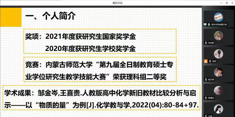 2020级学科教学专业邹金岑交流分享她在研究生期间参加教学技能大赛,教育实习和此次获得国家奖学金的心得体会,为专业学位研究生的学习带来一些实际建议,也激励同学们更认真,更积极的面对接下来的研究生生活。