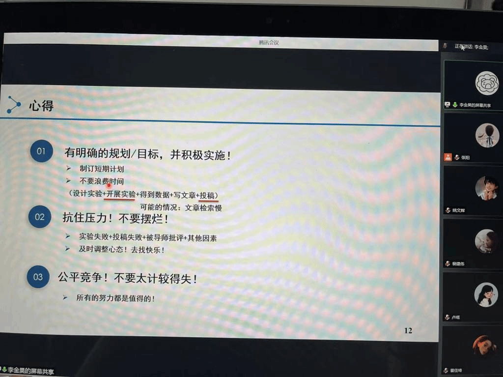 2019级学术专业的国家奖学金获得者分享了自己在读研期间的科研经验、学习方法、获奖感受。研究生期间要有目标、有规划、分阶段地开展学习。良好的学习习惯、健康的心理状态是始终保持积极学习状态的重要因素,要合理规划安排,提高自己的综合素养,并强调了实验室安全的重要性。