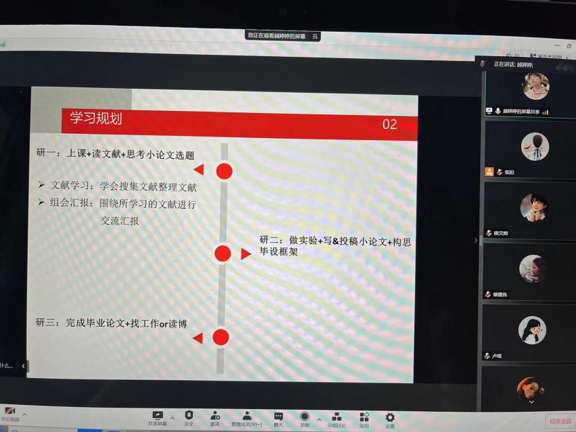 会议由研究生教学秘书张阳主持,我院2021年国家奖学金获得者特日格勒、李金昊、越婷婷、邹今岑四名同学以及2019级,2020级,2021级同学参加了此次分享会。