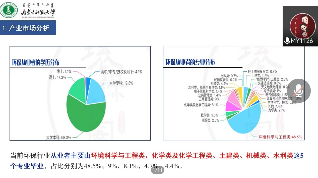 2022年5月24日,晚7:00-9:00,化学与环境学院环境科学系主办了一次题目为《如何在当下的市场环境中更好地进行职业规划——环保市场分析》的线上就业指导活动,其目的在于为毕业季的2018级环境科学专业学生就业进行全方位指导,提高我院环境科学专业的就业水平和质量,以此激励同学们向更为广阔的环保市场挺进。