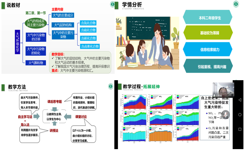 闫颖超以说课的形式,从说教材、说学情、说教学方法和说教学过程等几个方面对大二的“环境化学课程中的大气环境化学中主要污染物”内容进行了阐述。 说课结束后,环境系的各位老师对闫颖超的说课进行了评价,并提出了建议。同时,老师们还分享了自己的说课经验,老师们就“在线上授课过程中如何提高学生的学习兴趣”、“课程中如何融入思政”、“对分课堂教学模式的设计与应用”方面,提出了自己的见解,并分享了参考文献和资料。