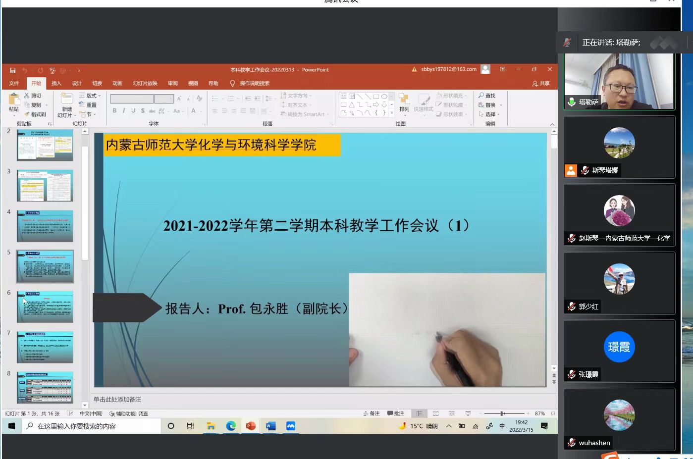 接下来,包永胜院长带领大家充分研讨了由包院长拟定的2021-2022学年第二学期本科教学工作会议内容,以教研室为单位,围绕化学专业开放实验的实施、参加各种比赛学生的选拔方法、师范类学生分类培养及培养方案的调整等方面展开了热烈的讨论。针对以上本科教学工作的改进与创新,老师们都各抒己见,充分发表了自己的想法和意见,体现了每位教师对化学专业建设发展的关心与支持,并能主动积极的参与进来,为化学专业的优化建设贡献力量。