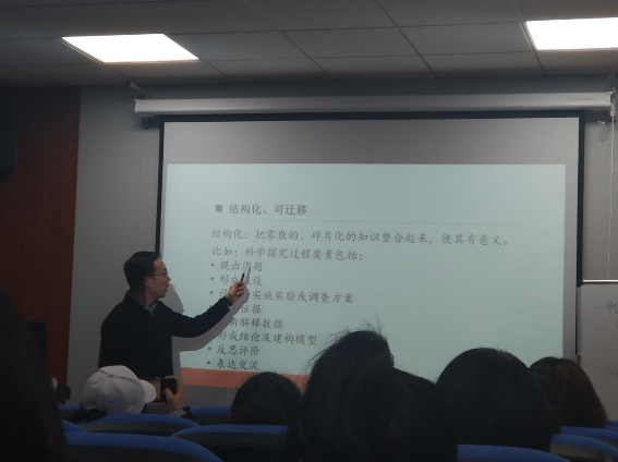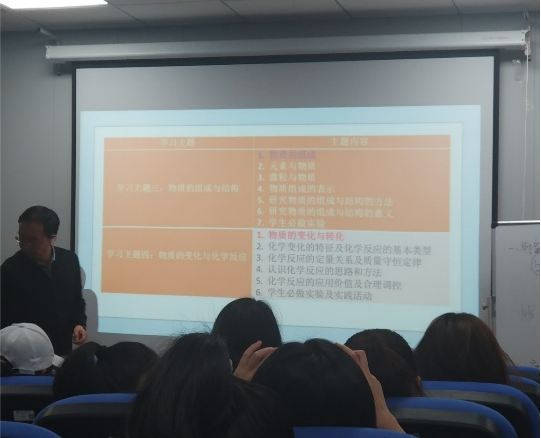 其次,刘老师根据《追求理解的教学设计》以及《义务教育化学课程标准(2011版)》讲明了什么是“大概念”,并以初中化学的五个学习主题为例,指出“大概念”是如何在主题内容中进行渗透的。随后,刘老师讲了教学中的“结构化”、“可迁移”策略,并给出了化学教学中的具体实例,增进了同学们的理解。接着,刘老师就教学改革中的变化,谈及了真实情境下的“深度学习”、“项目化学习”、及“大单元整体教学设计”等热点问题。