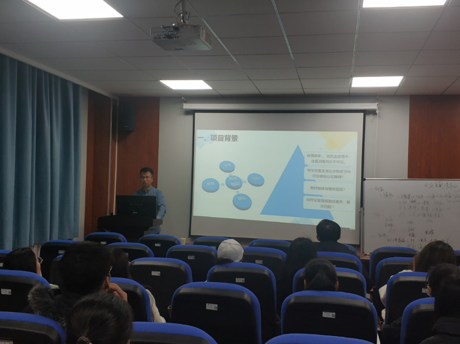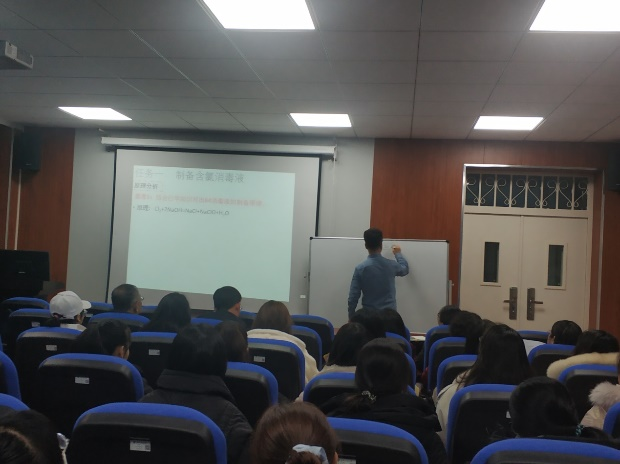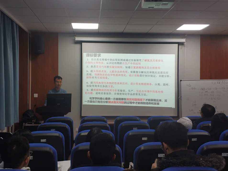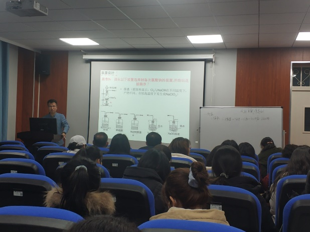 张欣苹老师首先进行了“战役中的化学——走进含氯消毒液”的教学示范,进而针对这节课的教学设计,详细讲述了设计授课环节和选择教学方法等的目的和意图。