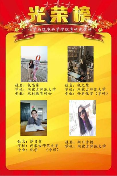我院2019届本科毕业生共有208人,考研录取48人,考研升学率为23%。其中,2015级环境科学汉班39名毕业生中,有15人被录取,考研升学率为38.5%;2015级化学汉班57名毕业生中,有17人被录取,考研升学率为29.8%;2015级化学蒙班55名毕业生中,有9人被录取,16.4%;2015级材料化学班29名毕业生中,有7人被录取,考研升学率为24.1%。