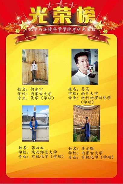 多年来,我院学生因扎实的专业功底和突出的科研潜力备受国内知名高校的青睐。今年,有3名同学考入中国科学院继续深造,如:2015级化学汉班闫晶晶同学被中国科学院山西煤炭化学研究所录取,2015级环境科学汉班胡娜娜同学被中国科学院烟台海岸带研究所录取,2015级材料化学班刘志坤同学被中国科学院福建物质结构研究所录取。有5名同学被“世界一流大学建设高校”录取,其中录取的高校有:南开大学、哈尔滨工业大学、南京大学、东北大学、新疆大学等;有20名同学被 “世界一流学科建设高校”录取,其中录取的高校有:北京交通大学、北京化工大学、内蒙古大学、辽宁大学、大连海事大学、上海大学、中国矿业大学、西北大学、长安大学、陕西师范大学、宁夏大学等。