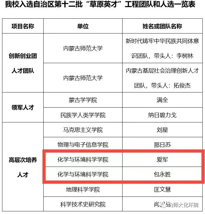 近日,自治区第十二批“草原英才”工程项目评审结果公示,在高层次培养人才的项目中,我院教师包永胜、爱军成功入选高层次培养人才。