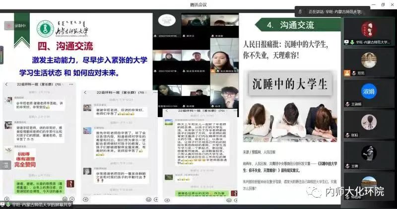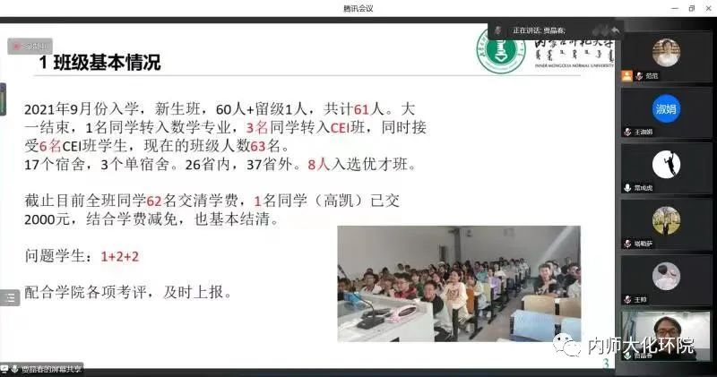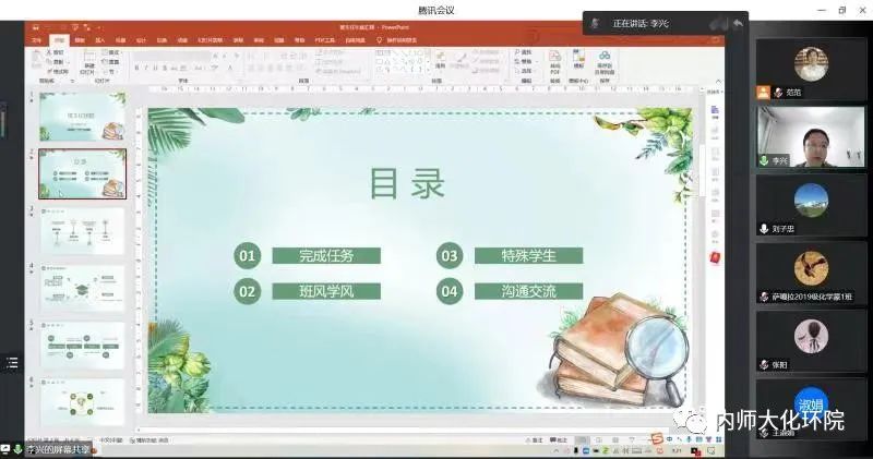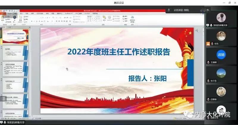 本次会议由各班班主任分别进行述职报告。各位老师从班级实际情况与班主任工作需要出发,从班级基本情况、班风学风、奖助贷补、社会实践以及教学技能竞赛等方面进行了详细的分析和总结,并针对学校学生管理方面的重点、难点进行了探讨与展示。班主任老师结合具体案例,分享了在学生管理中的一些成功经验,深入浅出的谈了新形势下班主任工作面临的困难和挑战,对今后怎样做好学生工作等问题谈了各自的想法,并表示在日后的教学过程中应当努力激发学生的主动性,培养学生良好的学习生活状态。
