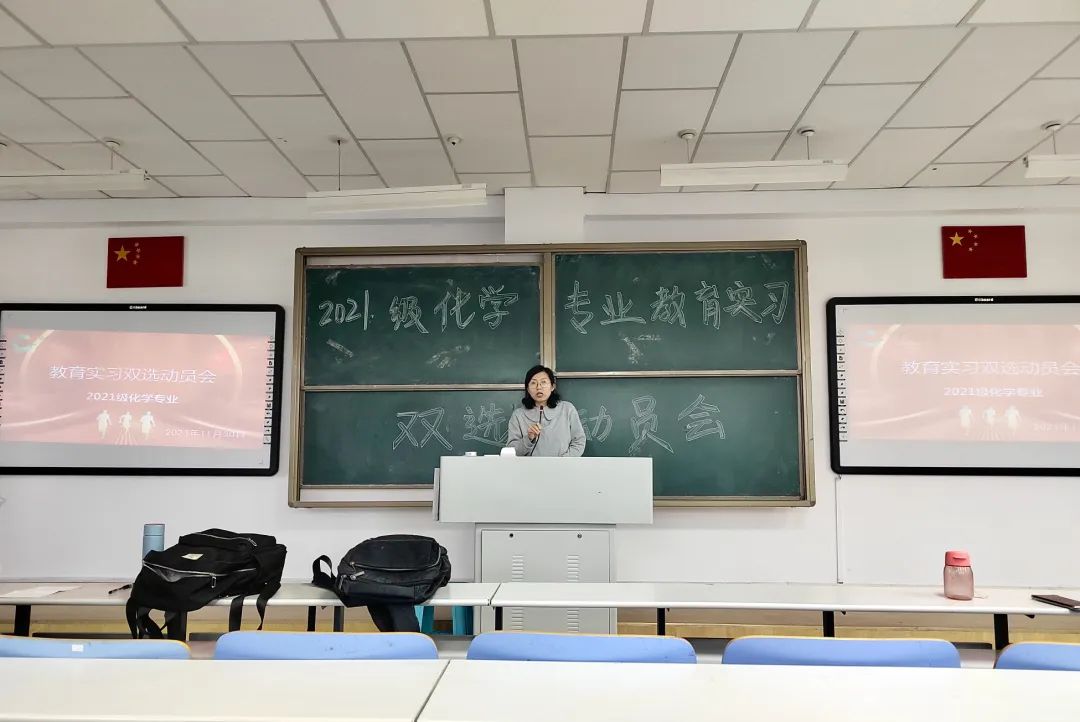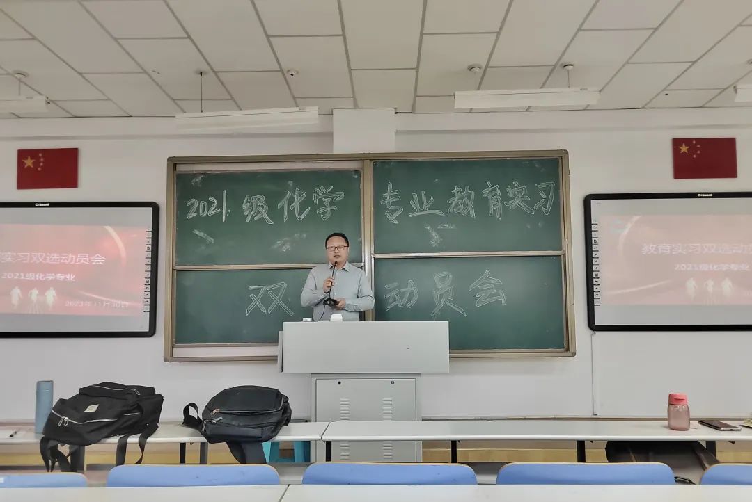 为有效落实教育实习双选,为了让每位师范生能正确认识教育实习的目的、任务,11月30日,我院在盛乐校区行知楼118室,举办了2021级化学专业教育实习双选动员会。副院长包永胜出席会议,2021级化学专业的全体本科生及教育实习的带队教师参加会议。会议由教法化工教研室主任王海燕主持。