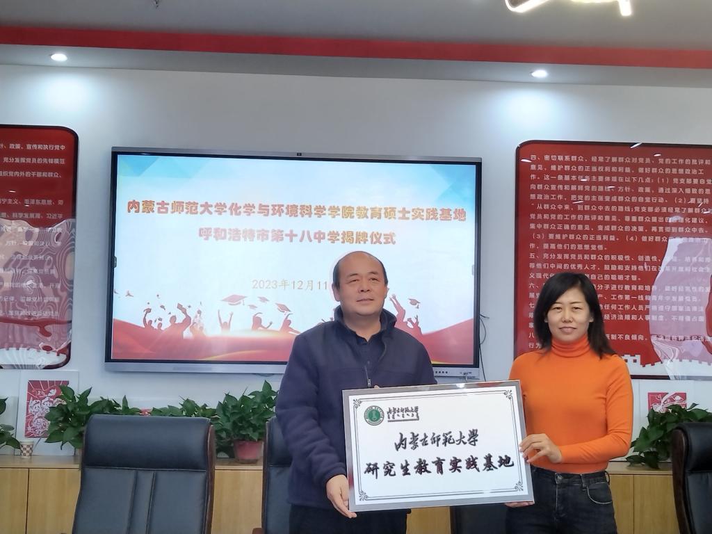呼和浩特市第十八中学安雪峰校长和永利官网研究生院副院长闫春梅共同签署《永利集团304、呼和浩特市第十八中学共建教育硕士实践基地协议书》,为教育硕士实践基地揭牌。随后给实习指导老师颁发了聘书。