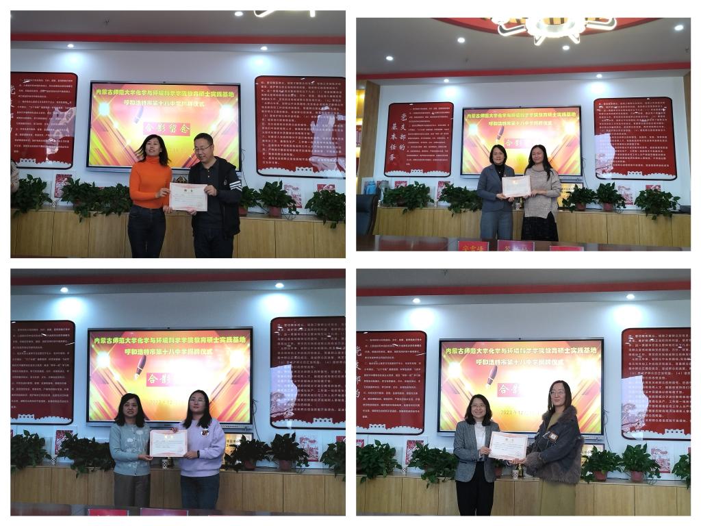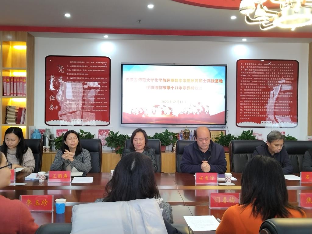 呼市十八中安雪峰校长,副校长石福和魏杰梅,教导处副主任董满元、王丽春,办公室副主任董瑞峰,高一化学指导教师邱亚楠,还有十八中部分教师和永利官网研究生院副院长闫春梅,永利集团304副院长焦燕,学科教学(化学)学位点负责人李玉珍,研究生导师王晓丽、陈丽萍、韩明梅,学院的部分研究生出席仪式。