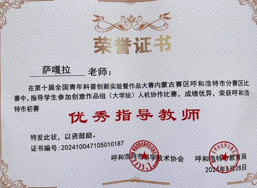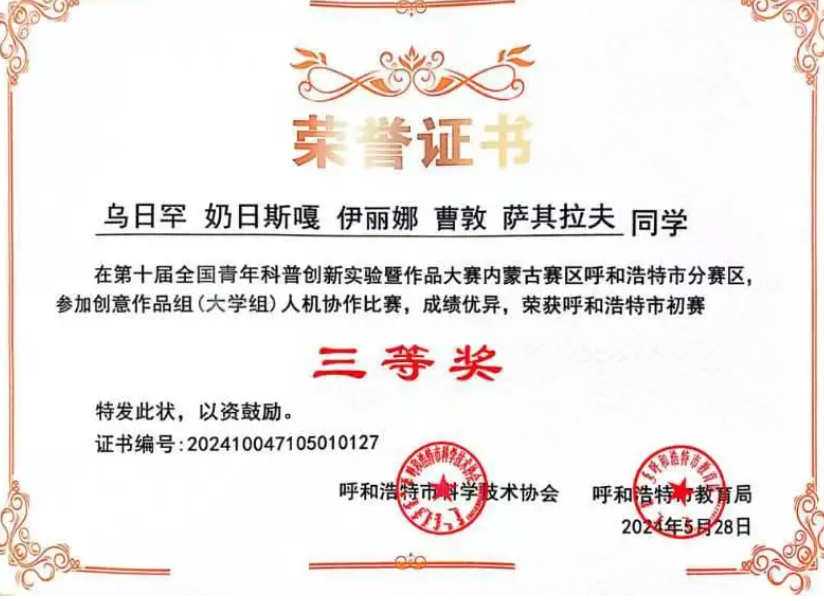 6月1日,第十届全国青年科普创新实验暨作品大赛内蒙古呼和浩特赛区的颁奖典礼在呼和浩特市第十九中学文体馆顺利举行。我院参赛团队作品“水质科普创新实验”荣获创意作品组(大学组)人机协作三等奖,学院教师、内蒙古自治区绿色催化重点实验室萨嘎拉副教授荣获“优秀指导教师”。