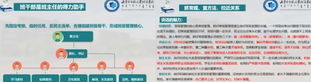 韩德老师针对班级管理,分别从培养班干部、树立榜样、建立班规、开好班会、做好谈话五方面结合实例为学生进行了详细的介绍;针对课堂教学从课程标准、教材分析、学情分析、授课过程、教案编写与反思等方面结合实例进行了讲解、分享了丰富的教学经验,为学生提出了宝贵的建议。