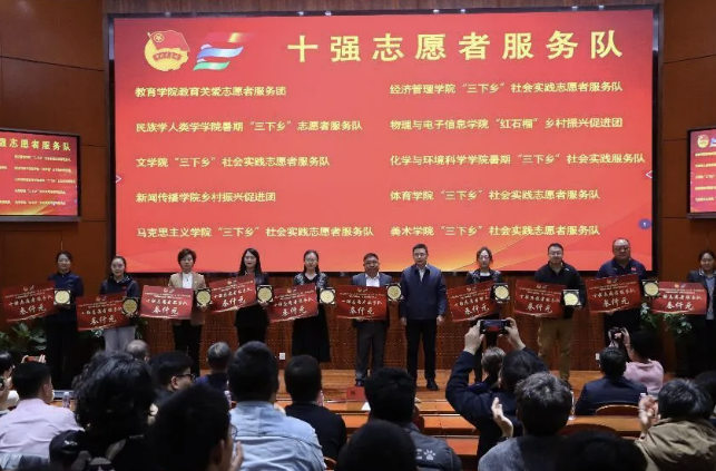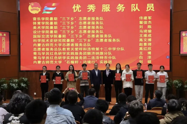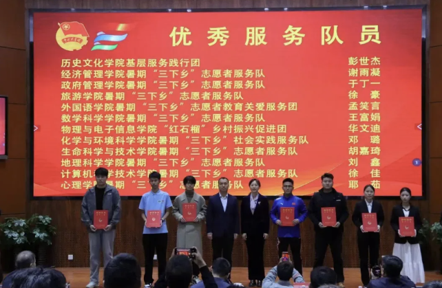 在本次表彰大会中,我院2024年暑期“三下乡”志愿者服务队荣获“十强志愿者服务队”荣誉称号;范磊老师荣获“优秀指导教师”荣誉称号;邓璐同学荣获“优秀服务队员”荣誉称号。