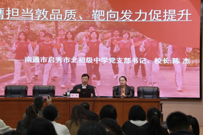 上午,启秀市北初级中学党支部书记、校长陈杰开展题为《挺膺担当敦品质、靶向发力促提升》的专题讲座。陈校长讲述这所学校拥有丰富的教育资源和深厚的文化积淀,承清末状元、近代著名实业家和教育家张謇先生“忠信持之以诚、勤俭行之以恕”的校训,追寻“诚恕惟启,博约成秀”的情怀,学校教育教学呈高质量发展,着力打造南通学子“梦开始的地方”。