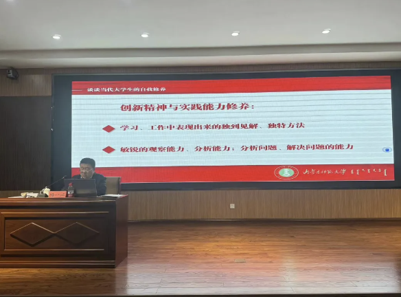 杨教授围绕“修养的意义和实质”、“当代大学生自我修养的主要内容”、“当代大学生自我修养的途径和方法”三方面表述了当代大学生提升自我修养的重要性。杨教授现身说法、情深意切、润物无声,用深入浅出的语言触动了同学们的心灵,让同学们可以清晰地认识到自我修养对于个人成长、社会发展的重要性,也为同学们指明了提升自我修养的方向。