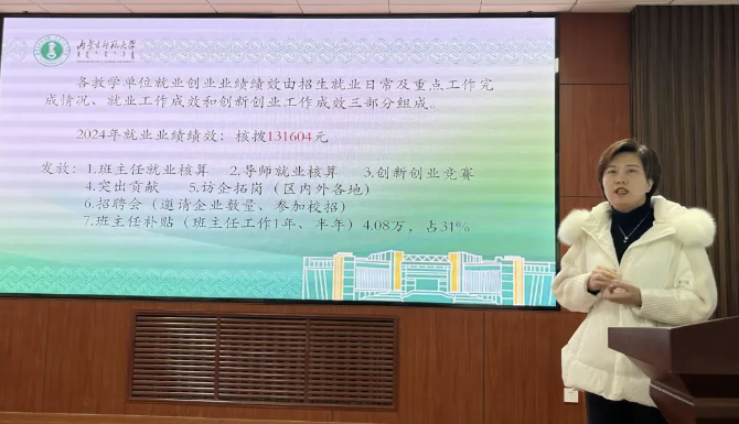 范磊介绍了就业创业绩效的分配办法,就期末学生工作进行安排。要求各班级开展诚信考试主题班会,让学生知晓违纪处分条例相关内容,杜绝考试作弊事件发生,并对近期雪天湿滑易发生安全事故的风险作温馨提示。
