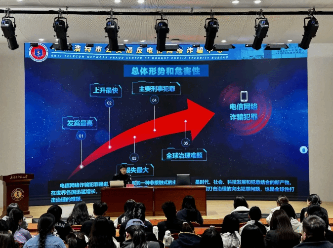 为进一步提升师生反诈防骗意识,有效防范电信网络诈骗,守护师生财产安全,营造平安和谐的校园环境,4月9日下午,我院在赛罕校区信息楼学术报告厅举办反诈安全专题讲座。本次讲座特邀呼和浩特市公安局反诈中心赵书锐警官主讲,全体研究生参加。