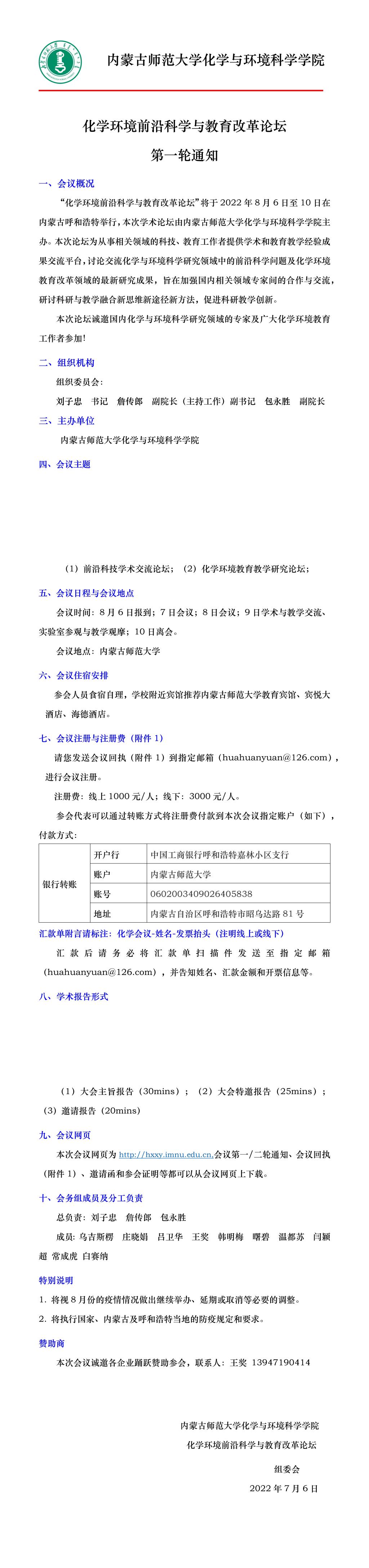 永利集团304化学环境前沿科学与教育改革论坛第一轮通知