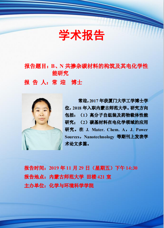 2019年11月29日下午14:30赛罕校区田楼421教室,永利集团304举办学术交流会。学院副院长包永胜教授、徐爱菊教授、贾晶春副教授及研究生等30余人参加本次学术交流。本次学术交流由我院年轻博士常迎老师以“B、N共掺杂碳材料的构筑及其电化学性能研究”为题作学术报告,与参会人员分享基于聚合物自组装可控构筑B、N共掺杂碳材料研究方面取得的一些成果。